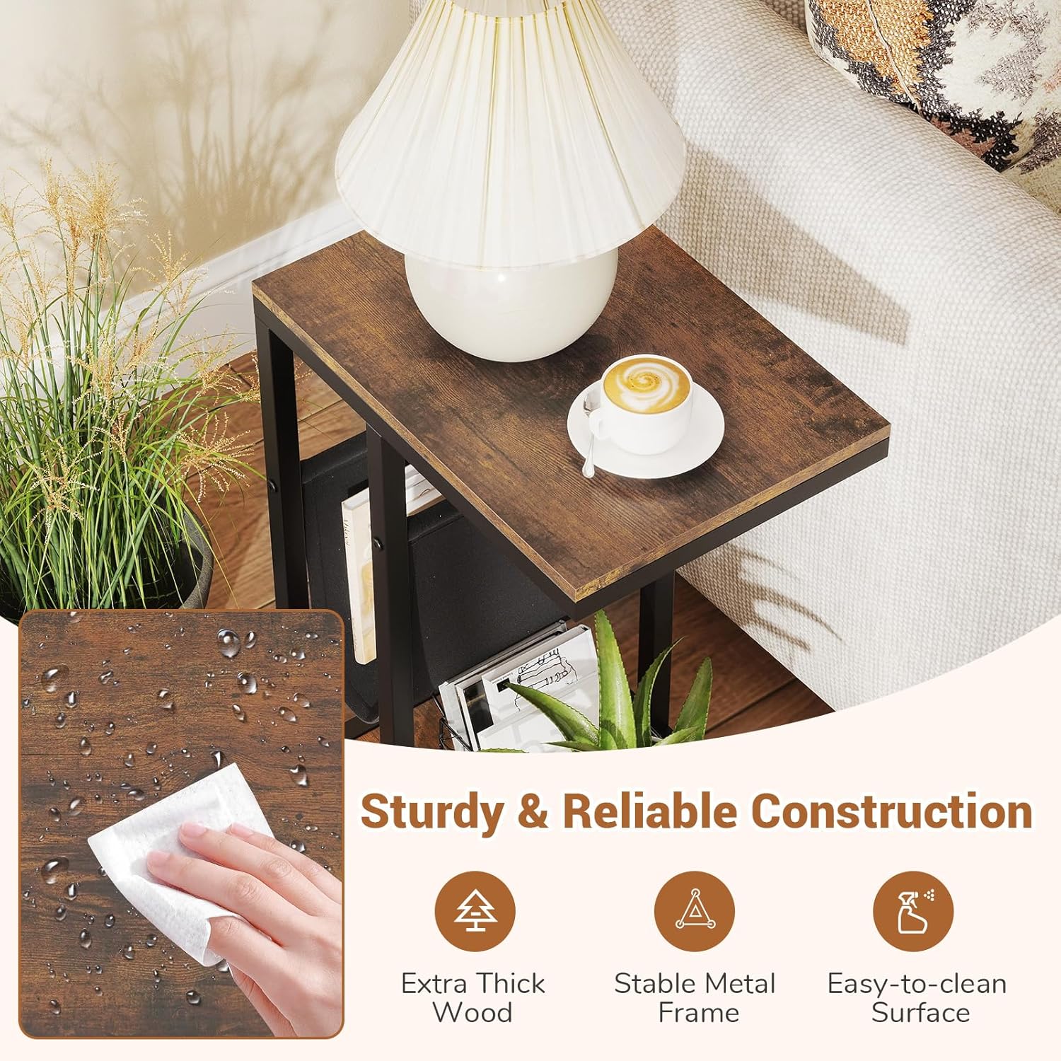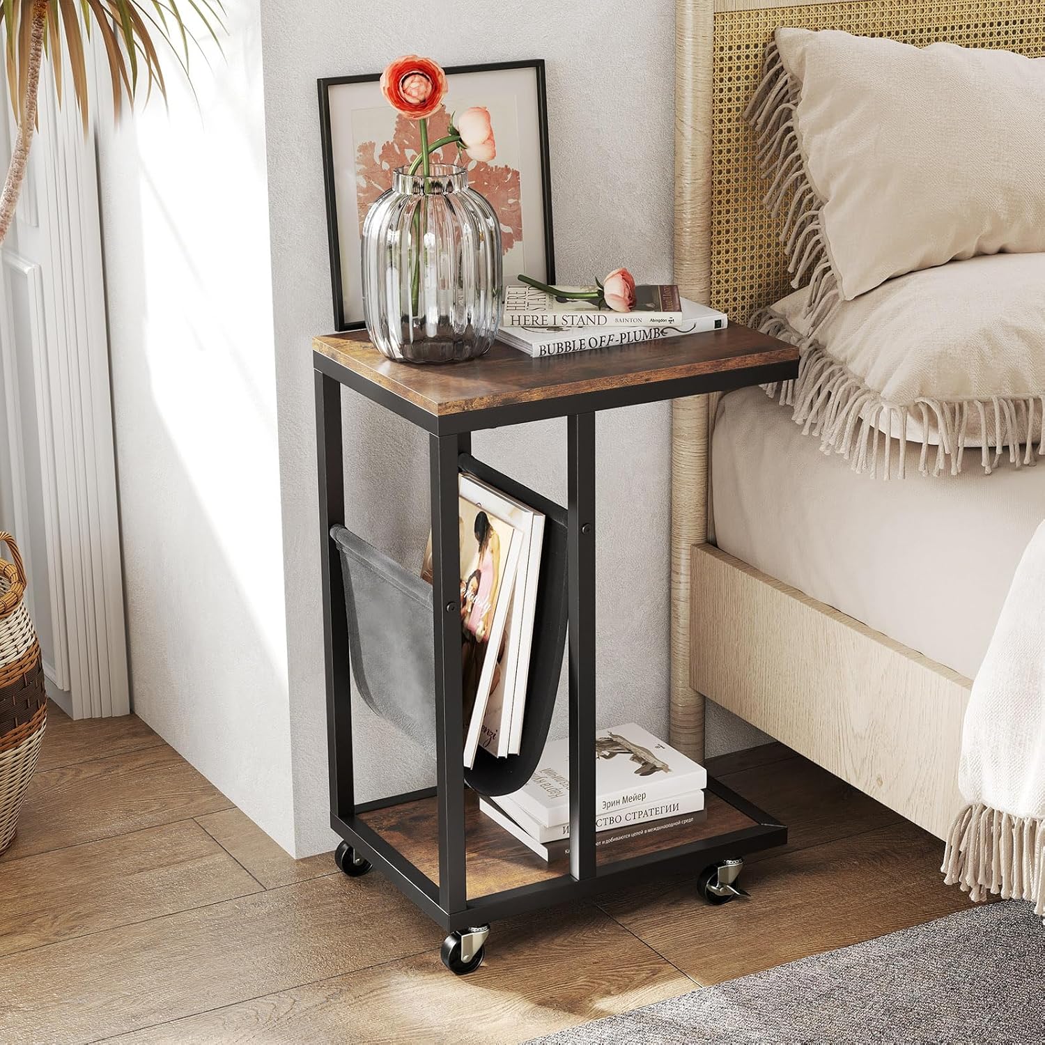 Description:Our C-Shaped end table is committed to offering you extra storage space in a small room. Designed with an adequate tabletop and a storage bag underneath, the end table has plenty of storage space to put snacks, magazines, coffee cup and more. Perfect for keeping items near your bed, sofa, or armchair to fill the awkward gaps to maximize the storage space. Moreover, sturdy steel frame further enhance its overall stability. Vintage wood grain finish creates a sleek, contemporary aesthetic, blends well with a wide range of home and office decors and can be used as a side table, sofa table, bedside table, coffee table, etc.Features:Ample storage space keeps your room clean and tidy4 universal casters with 2 lockable ones ensure great stabilityPremium board with charming rustic finish for decorationSturdy steel frame is not easy to wobble or crackSkinny and narrow side table works perfectly in small spacesSmooth tabletop is easy to clean and maintainIndustrial retro design adds a touch of charm to your homeUsed as a side table, sofa table, bedside table, coffee table, etc.Specifications:Color: Rustic Brown + BlackMaterial: Engineered Wood, Canvas, MetalOverall Dimensions: 16" x 11" x 23" (L x W x H)Space Between 2 Tiers: 19"Base Height: 3"Weight Capacity: 95 lbsNet Weight: 10 lbs1 x C-shaped End Table1 x User Manual