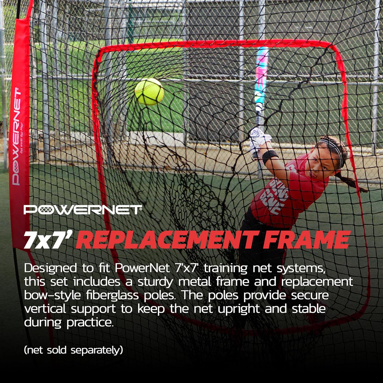 The PowerNet 7'x7' Replacement Frame is a high-quality metal frame designed to fit PowerNet 7' x 7' training net systems. This set includes the sturdy metal base frame and bow-style fiberglass poles for vertical supports to keep the net upright and secure. Built with heavy-duty materials, the easy-to-assemble frame and poles are designed to withstand repeated impact from practice sessions. Intended for ages 12 years and older.