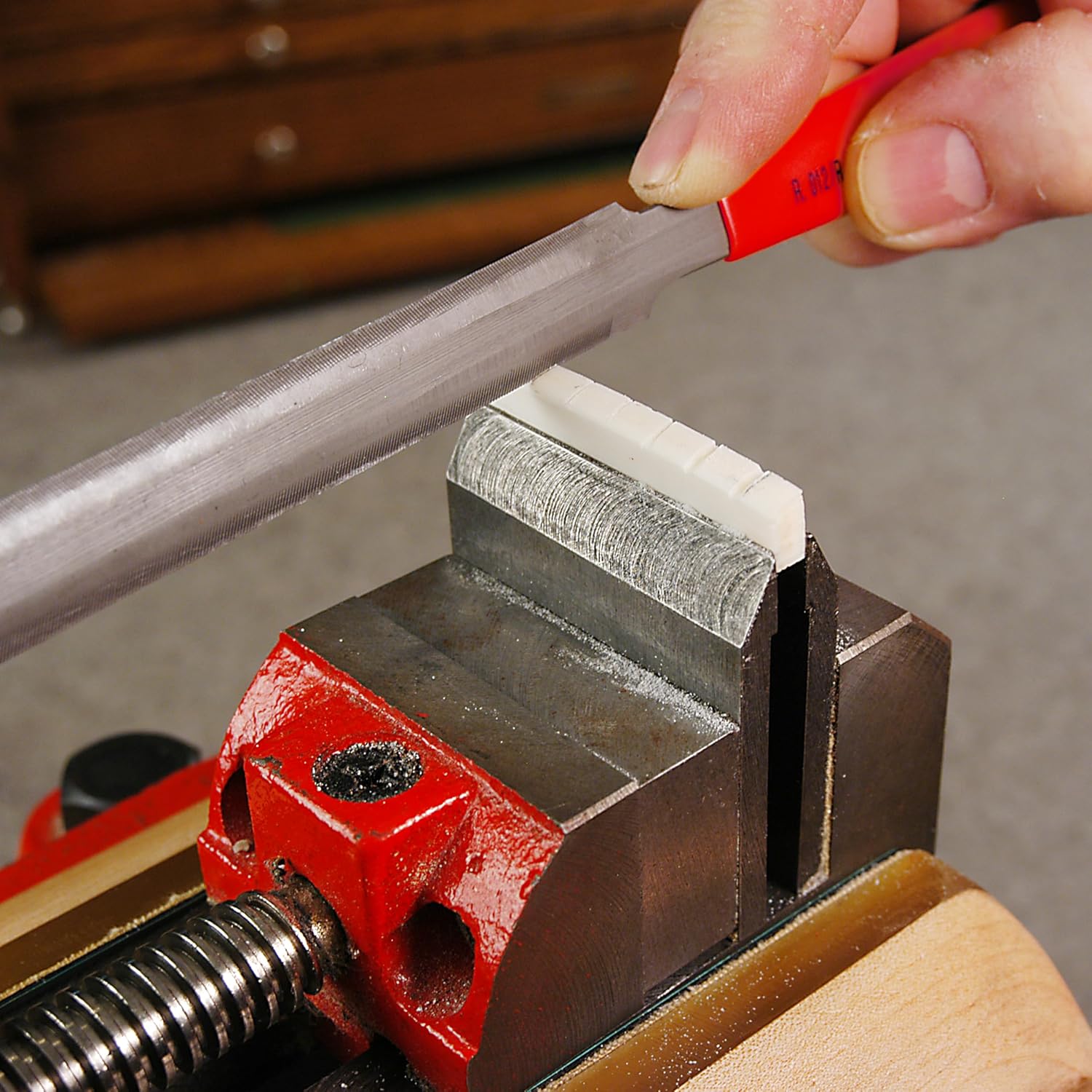 Everything you need to make a nut or saddle from scratch—just like a pro The StewMac Nut and Saddle Making Tool Set includes all the essential tools professional luthiers use to shape, slot, and space nuts and saddles with precision. Whether you're upgrading a factory guitar or building custom instruments, this set is your foundation for clean, accurate setup work.This money-saving kit includes:Shaping Files (Set of 2): Each steel file features Coarse, Medium, Fine, and Extra Fine cuts for fast shaping and polishing of nut and saddle blanks.Gauged Saw (0.010"): Ideal for starting new slots and trimming parts. A versatile tool for nut, saddle, and small detail work.Double-Edge Slotting Files (Set of 4): Custom-sized to cut round-bottom slots for most common string gauges. Includes .012"/.020", .026"/.032", .036"/.042", and .050"/.060".Nut and Saddle Vise: Heavy, compact vise with tapered jaws designed for nut and saddle work without blocking access to your tools.String Spacing Rule: Automatically calculates proportional string spacing for accurate layout without complicated math.Feeler Gauges (Set of 11): Precision gauges for accurately filing slot depths and measuring string-to-fret clearance.This is the same quality toolset we supply to busy repair shops worldwide. It's a smart investment for guitar techs, builders, and players who want professional results with every setup.BUILT TO LAST A LIFETIME – All StewMac tools are backed by our Lifetime Promise and expert tech support from experienced luthiers